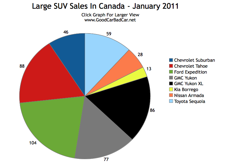 Add up all the sales of all the large mainstream sport-utility vehicles on sale in Canada in January 2011 and you get... drum roll.... 501. (59.3% of them were General Motors products.) Now compare that 501 figure, a total figure for a whole segment remember, with the sales of the vehicle ranked 14th in the small SUV Graph down below. The Jeep Wrangler, a member of a fairly mish-mashed list of small sport-utes and crossovers, saw its sales drop one unit to 512 in January, out-selling the whole large SUV category by 11. Perhaps a survey of Canadians would say they still see the merits of jumbo SUVs, but in practice, the market is nearly nonexistent.